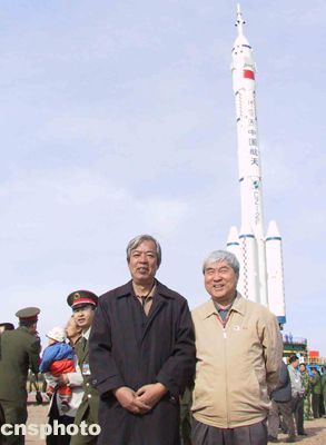 “神舟”五號(hào)載人飛船總設(shè)計(jì)師戚發(fā)軔(右)和“神箭”——長(zhǎng)征二號(hào)F運(yùn)載火箭總設(shè)計(jì)師劉竹生在箭船塔組合體垂直轉(zhuǎn)運(yùn)現(xiàn)場(chǎng)合影留念。中新社記者孫自法攝