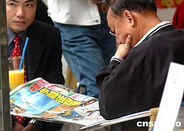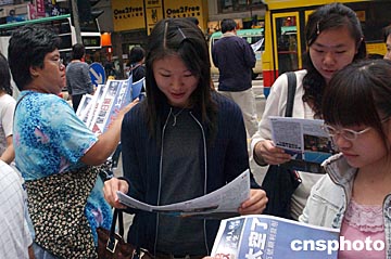 香港市民爭(zhēng)看號(hào)外!吧裰邸蔽逄(hào)飛船十月十五日順利升空,香港傳媒特發(fā)號(hào)外,圖為香港市民在街頭爭(zhēng)看號(hào)外。中新社記者:錢(qián)興強(qiáng)
