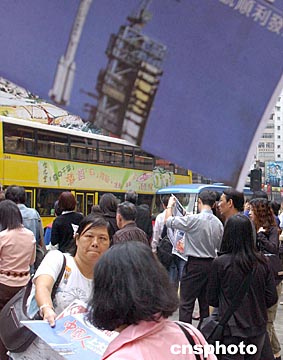 中國(guó)“神舟”五號(hào)十月十五日上午九時(shí)在酒泉衛(wèi)星發(fā)射中心成功升空,香港市民關(guān)注“神舟”五號(hào)首次載人發(fā)射成功。中新社記者:錢(qián)興強(qiáng)