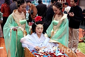 10月16日,河南省鄭州房地產(chǎn)交易會(huì)上,一房地產(chǎn)商擺出一個(gè)沐浴木桶,一個(gè)唐朝打份的美女身披薄紗坐在木桶內(nèi),蓋上一個(gè)水紋裝飾的蓋板,撒上玫瑰花瓣,做出“美女出浴”的造型,吸引與會(huì)者的目光。馬健 攝