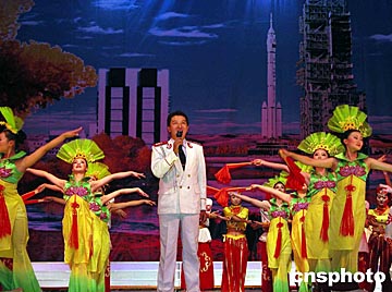 十月十六日晚,中國(guó)酒泉衛(wèi)星發(fā)射中心舉行專(zhuān)題晚會(huì),慶祝中國(guó)首次載人飛行圓滿(mǎn)成功。中心的科技人員和部隊(duì)官兵載歌載舞,歡慶“神舟”五號(hào)飛船成功發(fā)射和中國(guó)首位航天員順利返回。圖為歌舞表演《盛世中華》。中新社記者:孫自法