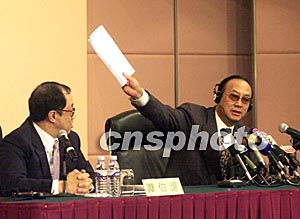 “內(nèi)地與澳門關(guān)于建立更緊密經(jīng)貿(mào)關(guān)系的安排”十七日下午在澳門特區(qū)政府總部舉行簽署儀式,國家商務(wù)部副部長安民和澳門經(jīng)濟財政司司長譚伯源,分別代表中央政府和澳門特區(qū)政府在協(xié)議上簽字,國家副主席曾慶紅專程來澳出席了簽署儀式。