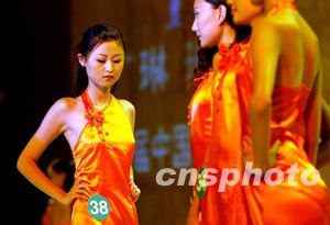 圖為選手展示具有濃郁中國傳統(tǒng)色彩的紅色晚裝。
