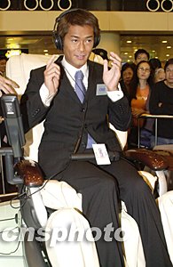 古天樂同場感受OSIM全球首張擁有音樂與按摩功能的音樂按摩椅。中新社記者:鄧慶樂