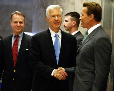 新當(dāng)選的加州州長(zhǎng)阿諾-施瓦辛格于周四會(huì)晤了競(jìng)選中的老對(duì)手、現(xiàn)任州長(zhǎng)戴維斯。雙方共同宣稱已經(jīng)開(kāi)始“友好關(guān)系”,并表示在阿諾正式接任州長(zhǎng)職務(wù)之前,兩人將并肩努力。