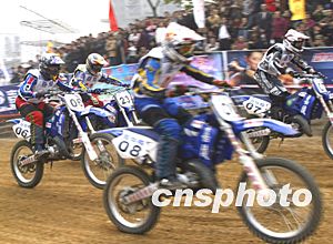 2003年“嘉陵杯”全國越野摩托車總決賽24日在重慶嘉陵賽車場拉開戰(zhàn)幕,來自全國21支隊(duì)伍120多名運(yùn)動(dòng)員參賽,為爭取全年的總排名爭奪異常激烈。中新社記者:趙振清