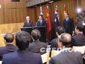 中國國家主席胡錦濤和澳大利亞總理霍華德10月24日在聯(lián)邦大廈聯(lián)合會見中澳記者。中新社記者 劉雨生 攝