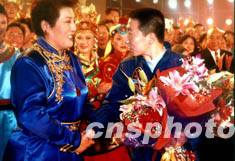 二十四日晚,北京舉行大型文藝晚會(huì)《圓夢》慶祝中國首次航天飛行圓滿成功。著名歌唱家德德瑪代表觀眾向航天英雄楊利偉獻(xiàn)花。作者:王玉