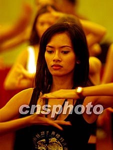 參加新絲路世界模特大賽的泰國(guó)小姐,十月二十七日在杭州跟隨中國(guó)教師一板一眼學(xué)習(xí)戲曲動(dòng)作藍(lán)花手。中新社記者:賈國(guó)榮
