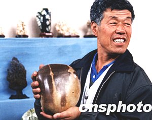 山西省垣曲有一位奇石收藏愛好著,不久前他在黃河小浪底水庫中發(fā)現(xiàn)了一顆圓石頭,石頭上有一個(gè)和“神州五號”載人火箭升空時(shí)的情景異常相似。2003年10月下旬,他為慶!吧裰菸逄枴钡陌l(fā)射成功,特將這塊奇石拿出來進(jìn)行展覽。張旦 攝