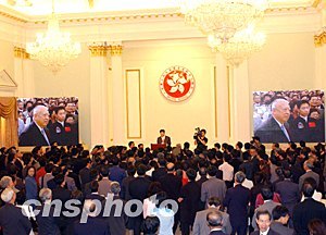 10月31日,身穿深藍色航天員制服的楊利偉在特首董建華陪同下進入禮賓府,特區(qū)政府和中聯(lián)辦官員、駐港部隊代表及各界知名人士在場歡迎。作者:洪少葵