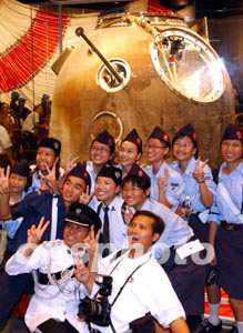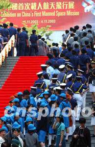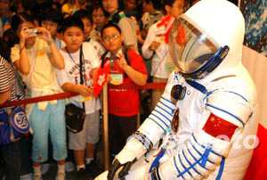 再往前,展出的就是展覽最神秘的部分──“神五”飛船返回艙、天空衣、天空食品和搭載的國(guó)旗等。在其后的正式開放參觀時(shí),這里擠滿了小朋友,好奇地問(wèn)這問(wèn)那,人人顯得很興奮,都說(shuō)感到自豪。