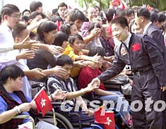 11月5日,香港特區(qū)政府在禮賓府舉行中國(guó)首次載人航天飛行代表團(tuán)歡送儀式,在場(chǎng)的群眾爭(zhēng)相與代表團(tuán)成員握手道別。中新社記者:鄧慶樂(lè)