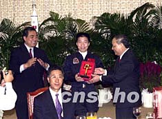 國家首飛航天員楊利偉及中國載人航天飛行代表團五日到澳門進行訪問,中央駐澳門聯(lián)絡(luò)辦舉行歡迎午宴,圖為中聯(lián)辦主任白志健在宴會上向楊利偉贈送紀念品。中新社記者:李剛