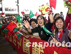 應(yīng)澳門特區(qū)政府的邀請,國家首飛航天員楊利偉及中國載人航天飛行代表團五日中午從香港乘船抵達澳門進行訪問,澳門各界數(shù)百人在外港碼頭熱烈歡迎他們的到來。 中新社記者:李剛