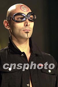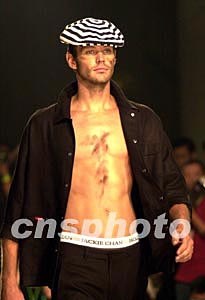 成龍系列男裝(二00四年春夏季男裝)中國揭幕式暨時裝展十一月五日晚在廣州舉行,外籍男模激情演繹“龍旋風(fēng)”時裝。作者:陳文