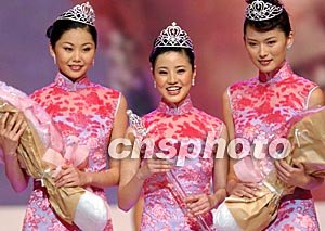 “2003中華小姐環(huán)球大賽”總決賽11月8日晚在香港會展中心舉行,圖為來自上海的佳麗江欣榮獲大賽冠軍、吉林佳麗胡古玥(左)獲亞軍、黑龍江佳麗谷雨(右)獲季軍。中新社記者:錢興強