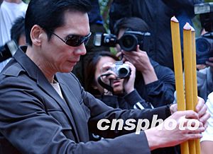 香港藝員劉青云、周聰在拜神儀式上。 中新社記者:錢興強(qiáng)