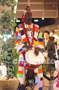 法國參展商出動(dòng)黑人樂手擊鼓高歌助興美容展。中新社記者:洪少葵