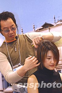 香港發(fā)型設(shè)計(jì)師示范入冬流行發(fā)型裝飾。中新社記者:洪少葵