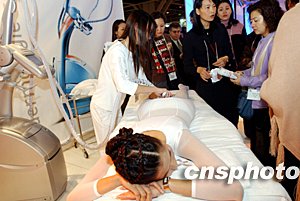 在香港舉行的“2003亞太區(qū)美容展”上,香港菲萊雅公司在現(xiàn)場推介美容和瘦身療法,吸引眾多愛美女士圍觀。中新社記者:洪少葵