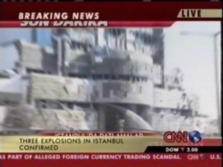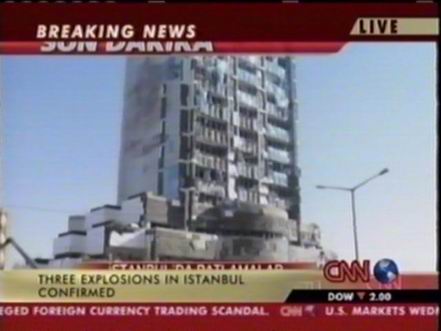 北京時間11月20日下午,位于土耳其伊斯坦布爾北部的土耳其匯豐銀行總部附近發(fā)生兩次爆炸,部分銀行建筑被摧毀。此后英國駐伊斯坦布爾領(lǐng)事館以及一個居民區(qū)和一座清真寺也遭到襲擊。圖為爆炸中被損毀的匯豐銀行。(春風(fēng))