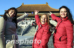 參加世界小姐大賽的各國(guó)佳麗十一月二十日參觀了北京著名的故宮博物院,雄偉的太和殿讓佳麗們眼界大開。中新社記者:廖文靜