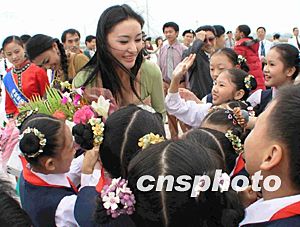 世界小姐參賽佳麗對(duì)前來(lái)歡迎的小朋友們十分親善。趙曉兵 攝