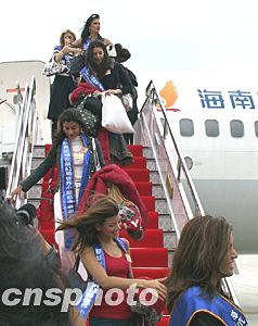 世界小姐參賽佳麗陸續(xù)走下舷梯。關(guān)向東 攝