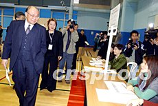 選舉管理委員會(huì)主席胡國(guó)興法官到達(dá)九龍公園投票站參觀,對(duì)準(zhǔn)備就緒的投票站設(shè)施感到滿意。中新社記者:洪少葵