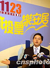 十一月二十二日,香港政制事務(wù)局局長(zhǎng)林瑞麟在擔(dān)任電視節(jié)目“全城投票樂(lè)安居”嘉賓時(shí)呼吁香港市民珍惜明天的投票機(jī)會(huì)。中新社記者:潘索菲