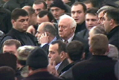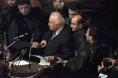 11月22日,格魯吉亞新一屆議會舉行第一次會議。當(dāng)謝瓦爾德納澤在議會演講時,幾十名反對派人士沖入議會大廈,要求總統(tǒng)辭職?偨y(tǒng)的支持者和反對派人士發(fā)生爭執(zhí),議會大廳一片混亂。謝瓦爾德納澤隨即在保鏢的保護(hù)下撤離,并表示拒絕辭職。