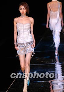 十一月二十五日晚,2003中國國際時裝周·房瑩2004春夏時裝發(fā)布會在北京中國大飯店舉行,設(shè)計師用明快的色彩、古青銅器上花紋一般紋理,讓觀眾感受經(jīng)典就是永恒。中新社記者:盛佳鵬