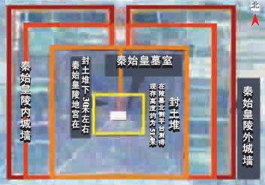 物探發(fā)現(xiàn)地宮中的墓室和宮墻均為石質(zhì)結(jié)構(gòu),地宮在封土堆以下30米左右,地宮中的墓室邊界東西長(zhǎng)約170米,南北寬約145米。這是一種迄今為止首次發(fā)現(xiàn)的墓葬形式,在物探考古過程中,專家還發(fā)現(xiàn)大范圍、強(qiáng)異常的汞含量,初步證實(shí)了《史記》中記載的“以水銀為百川、江河、大!钡恼鎸(shí)性。
