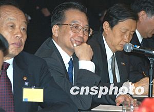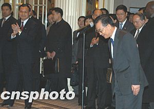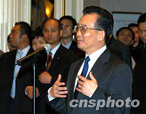 美東時(shí)間十二月七日下午,中國(guó)總理溫家寶甫抵紐約,即接見華僑華人、留學(xué)生和中資機(jī)構(gòu)代表。溫家寶說(shuō),大家冒著嚴(yán)寒風(fēng)雪,守候在這里好幾個(gè)小時(shí),歡迎我和我的同事。大家的這份情意,不僅是給我和同事的,更是給祖國(guó)和人民的。他代表中國(guó)人民和中國(guó)政府,向旅居在美國(guó)的華僑、華人、留學(xué)生,向來(lái)自香港、澳門和臺(tái)灣的同胞,向領(lǐng)館的工作人員,致以親切的問(wèn)候和良好的祝愿。隨后他向前方和左右三鞠躬,感謝僑胞們的熱情歡迎。作者:陳建