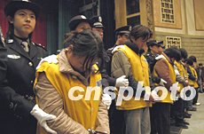 北京警方十二月九日對在冬季百日會戰(zhàn)以來查處的聚眾賭博、吸毒販毒、制假販假等五十余名違法犯罪人員進行公開處理。中新社記者:任海霞