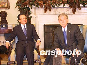 溫家寶總理對布什總統(tǒng)多次表示并且在今天的會談中再次表示堅(jiān)持中美三個(gè)聯(lián)合公報(bào)的原則、堅(jiān)持一個(gè)中國政策、反對“臺獨(dú)”的立場表示贊賞。他特別對布什總統(tǒng)反對臺灣新出現(xiàn)的旨在“臺獨(dú)”的所謂各種“公投”表示非常欣賞。