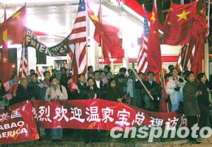 華盛頓僑界9日夜在溫家寶總理演講會(huì)場(chǎng)外集會(huì),高呼“國(guó)家統(tǒng)一,反對(duì)分裂”口號(hào)。中新社記者:余東暉