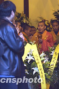 數(shù)十只兩岸三地各界贈送的花圈、花籃把整座三圣殿周邊裝點得分外肅穆,柯受良身著紅西服的半身遺像端放在正殿右側(cè),上端蓋有黑紗,前端放有寫著“佛力超度柯受良先生”的明黃色牌位。根據(jù)家屬意愿,由法師按中國傳統(tǒng)的佛教禮儀為其超度,其親朋依次入殿默哀致意。