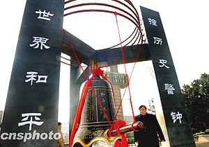 “和平大鐘”在侵華日軍南京大屠殺遇難同胞紀念館安裝成功,并將在12月13日舉行的悼念侵華日軍南京大屠殺30萬遇難同胞66周年儀式暨南京國際和平日集會上首次撞響。