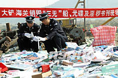 十六日,廣州大鏟海關在珠江口水域將今年以來沒收的“三無”船42艘和一批淫穢光碟、淫穢書刊公開銷毀。作者:朱曉丹