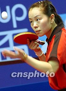 二零零三年女子世界杯乒乓球賽十二月十七日在香港舉行,中國參賽選手牛劍鋒在初賽上以4:0輕取日本選手梅村禮。中新社記者:錢興強