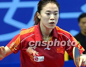 中國選手王楠在香港舉行的二零零三年女子世界杯乒乓球賽十二月十八日賽事上以4:0戰(zhàn)勝加拿大選手徐光宏。中新社記者:錢興強(qiáng)