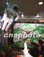十二月中旬正在北京舉行的冬季房展會上,一家房地產(chǎn)開發(fā)商請來“太空人”模型為樓盤促銷。作者:張雷