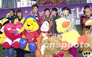 歌星鄧健泓、何韻詩、古巨基、組合Cookies四人(左起)12月22日在香港添馬艦廣場舉行之《環(huán)球嘉年華2003/4》出席「Neway 終極K Fun嘉年華」演唱會,獲主辦機構(gòu)送上大型毛公仔,以感謝為在場樂迷獻唱同樂。中新社記者:鄧慶樂