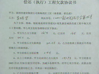 鄒遠貴:“我追了八年債,我沒回過家。沒辦法回去,1997年我父親去世了,我哭了10次!睋(jù)他們介紹,這條路是1994年3月上馬的,當時乳源縣政府以招商引資的方式引來廣西梧州明興房地產(chǎn)開發(fā)公司、深圳建設(shè)集團公司珠海西區(qū)工區(qū),三方約定:工程總投資5800萬元,由甲方乳源縣政府以征地、拆遷等形式出資580萬元,乙方廣西梧州方出資1000萬元,丙方深圳珠海工區(qū)自籌其余工程款4220萬元,并以大包干的形式負責工程項目的全部施工建設(shè)。然而在實施過程中,資金卻出現(xiàn)了問題。