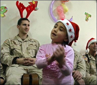 一支合唱團在美兵的各個慶祝地點穿行,帶領(lǐng)士兵們齊唱贊美歌。而作為迎接圣誕夜的重頭戲,駐伊美兵與伊拉克兒童一起舉行了歌舞比賽。