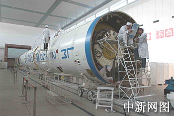 圖:"長(zhǎng)征二號(hào)丙"改進(jìn)型運(yùn)載火箭在總裝廠房進(jìn)行系統(tǒng)測(cè)試