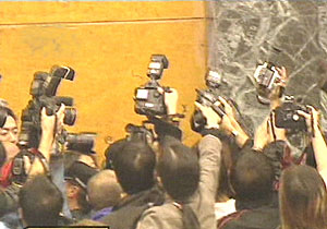 香港知名女星梅艷芳十二月三十日凌晨去世。香港眾多媒體到養(yǎng)和醫(yī)院報(bào)道一線消息。(電視截圖)