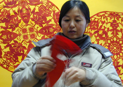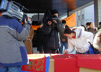 中新網(wǎng)1月2日電 正全力完成中國民間剪紙成為聯(lián)合國教科文組織非物質(zhì)文化遺產(chǎn)申報工作的中央美術(shù)學(xué)院非物質(zhì)文化遺產(chǎn)研究中心,2004年元旦這天在北京大學(xué)舉辦了第二屆“青年文化遺產(chǎn)日”活動,為支持剪紙藝術(shù)列入文化遺產(chǎn),全國26所高校的學(xué)生代表,在北京大學(xué)舉行支持中國剪紙申報文化遺產(chǎn)的簽名活動。